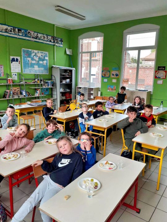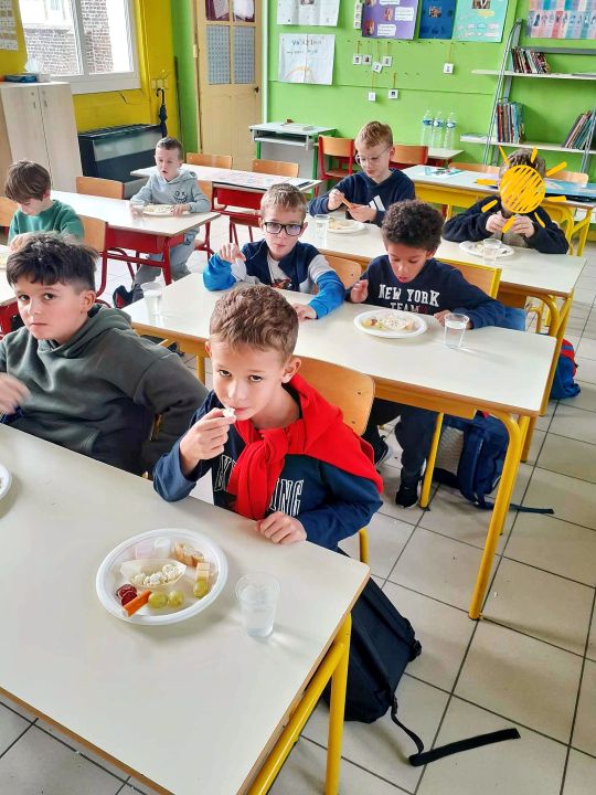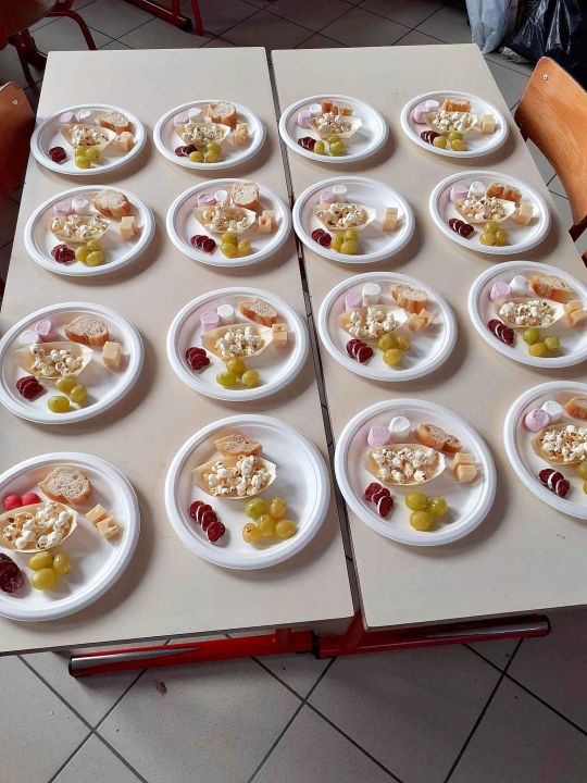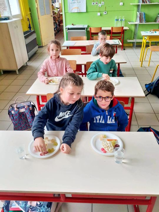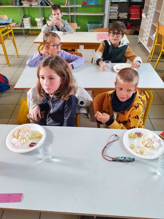 Les élèves de CE1 CE2 ont eu une petite surprise juste avant les vacances : pour la semaine du goût, ils ont eu un petit goûter contenant chaque catégorie d'aliments. Ayant travaillé cela en première période, ils ont pu déguster de l'eau (eau), du raisin